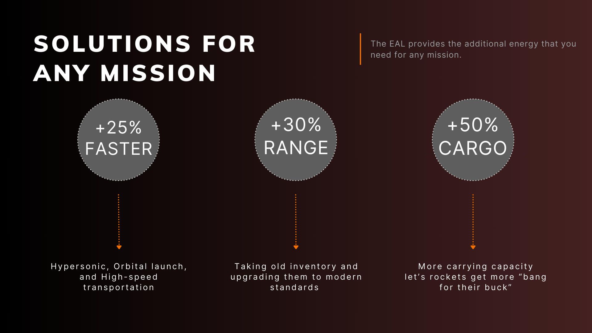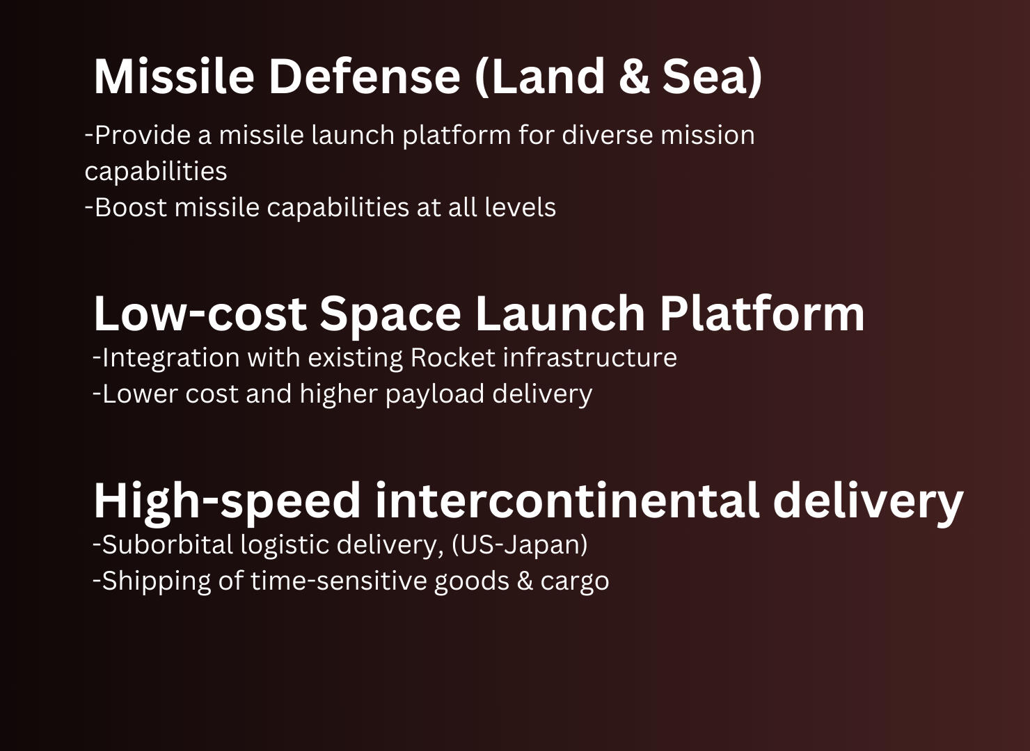 In the rapidly emerging point-to-point logistics sector, the EAL system enables a new paradigm in ultra-rapid cargo delivery between major global hubs. With initial routes planned between the United States and Japan, the system will handle payloads from 1000kg to over 10000kg with planned delivery times of just over 2 hours.